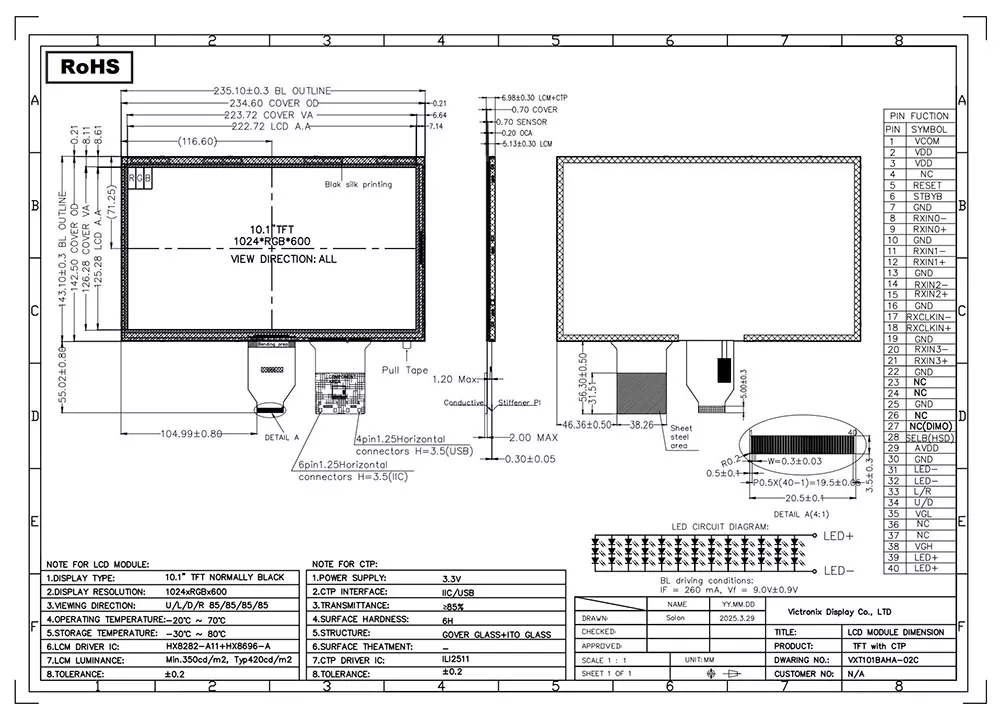 インテリジェンスの時代には、TFTモジュールを使用すると、必要なデータを視覚的に提示できます。 TFTモジュールの品質は、アプリケーションに重大な影響を与えます。 CTPを備えたVictronix 10.1インチ1024×600 LVDS TFTモジュールの利点は何ですか?最初は、420 cd/m²の明るさ、800:1のコントラスト比、すべての方向で80度の視聴角度、75%の均一性が鮮明な画像を保証します。第二に、HX8282A11+HX8696Aコントローラーとの6/8ビットLVDSインターフェースと、ILI2511 CTPコントローラーを備えた堅牢な5ポイント容量性タッチパネルをサポートします。さらに、寿命が30,000〜50,000時間の3×13レッドの白いバックライトを備えており、さまざまな産業用途での長期的な使いやすさが確保されています。さらに、ROHS標準に準拠し、最大8kVの空気や4kVの接触までの熱ショック、湿度、ESD保護など、厳密な信頼性テストに成功します。この製品は、-20°Cから +70°Cの範囲の極端な温度で効率的に動作し、-30°Cから +80°Cまでの深刻な貯蔵条件に耐えることができます。