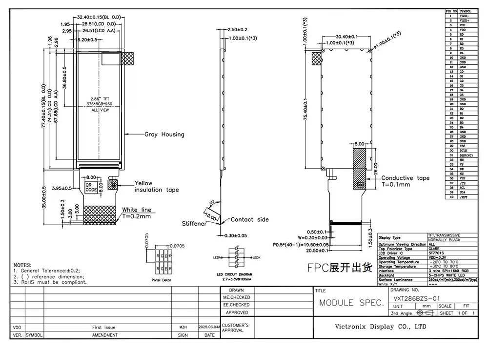 インテリジェンスの時代には、TFTモジュールを使用すると、必要なデータを視覚的に提示できます。 TFTモジュールの品質は、アプリケーションに重大な影響を与えます。 Victronix 2.86インチ376×960 IPS TFTモジュールの利点は何ですか?最初は、300 cd/m²の明るさ、1500:1のコントラスト比、すべての方向で85度の視聴角度、80%の均一性が鮮明な画像を保証します。第二に、ST7701Sを備えたSPI+16ビットRGBインターフェースと、30,000〜50,000時間の寿命で5-Dies White LEDバックライトをサポートし、さまざまな産業用アプリケーションでの長期的な使いやすさを確保します。それに加えて、ROHSの基準に準拠し、最大8kVの空気や4KVの接触までの熱ショック、湿度、ESD保護など、厳密な信頼性テストに成功します。この製品は、-20°Cから +70°Cの範囲の極端な温度で効率的に動作し、-30°Cから +80°Cまでの深刻な貯蔵条件に耐えることができます。