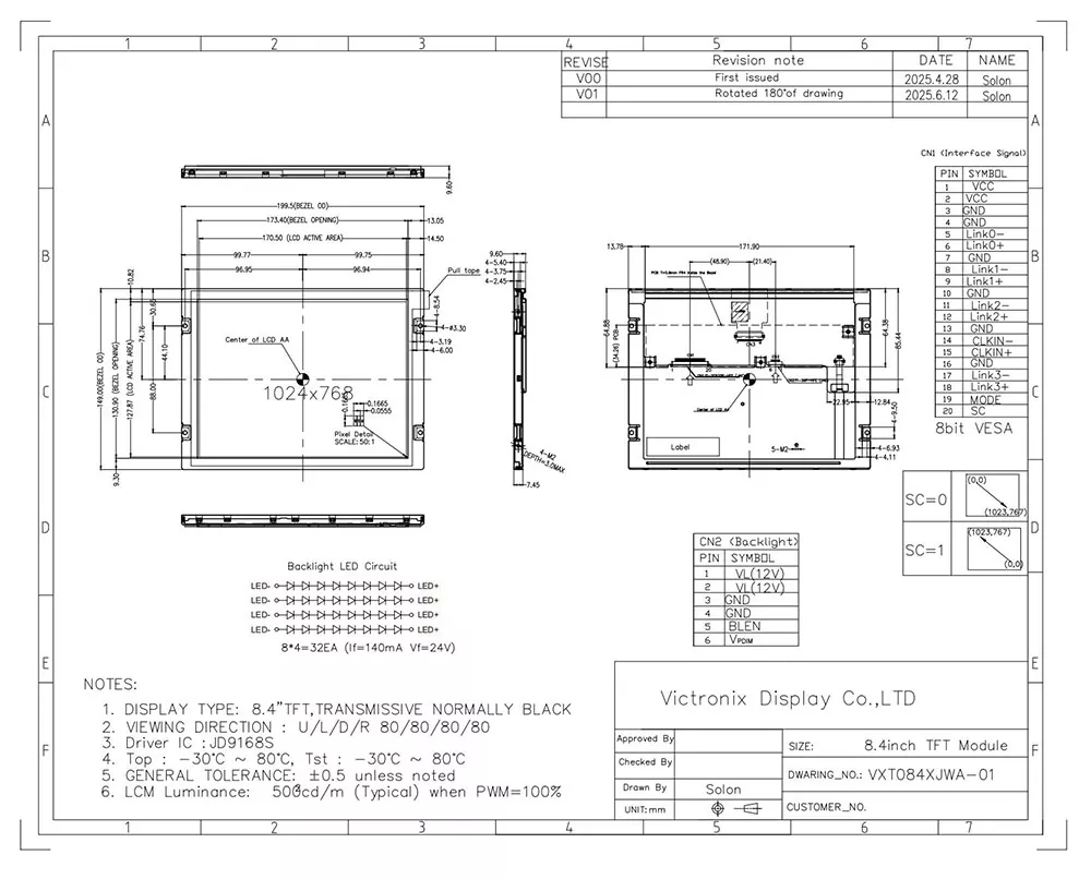 TFT LCDは、薄膜トランジスタテクノロジーを利用して画質を向上させる液晶ディスプレイの一種であり、日常生活に多数のアプリケーションがあります。中国のプロのTFTモジュールメーカーおよびサプライヤーとして、Victronix 8.4インチ1024×768 IPS TFT LCDが他のメーカーとは異なる理由は何ですか?第一に、500 cd/m²の典型的な明るさ、すべての方向の幅85°の視聴角度、1500:1のコントラスト比を提供し、さまざまな角度からの優れた読みやすさを確保します。第二に、50,000時間の典型的な寿命(初期輝度)で32の白LEDを使用したバックライトユニットを統合し、すべての照明条件で明確な視認性を確保します。また、ESD保護とJD9168Sコントローラーを使用したLVDSインターフェースをサポートします。さらに、熱衝撃(-30°C↔ +80°Cサイクル)、湿度貯蔵(60°C/90%RH)、機械的振動など、厳密な環境試験に合格し、拡張温度範囲(-30°C〜 +80°C)でシームレスに動作できるようにします。